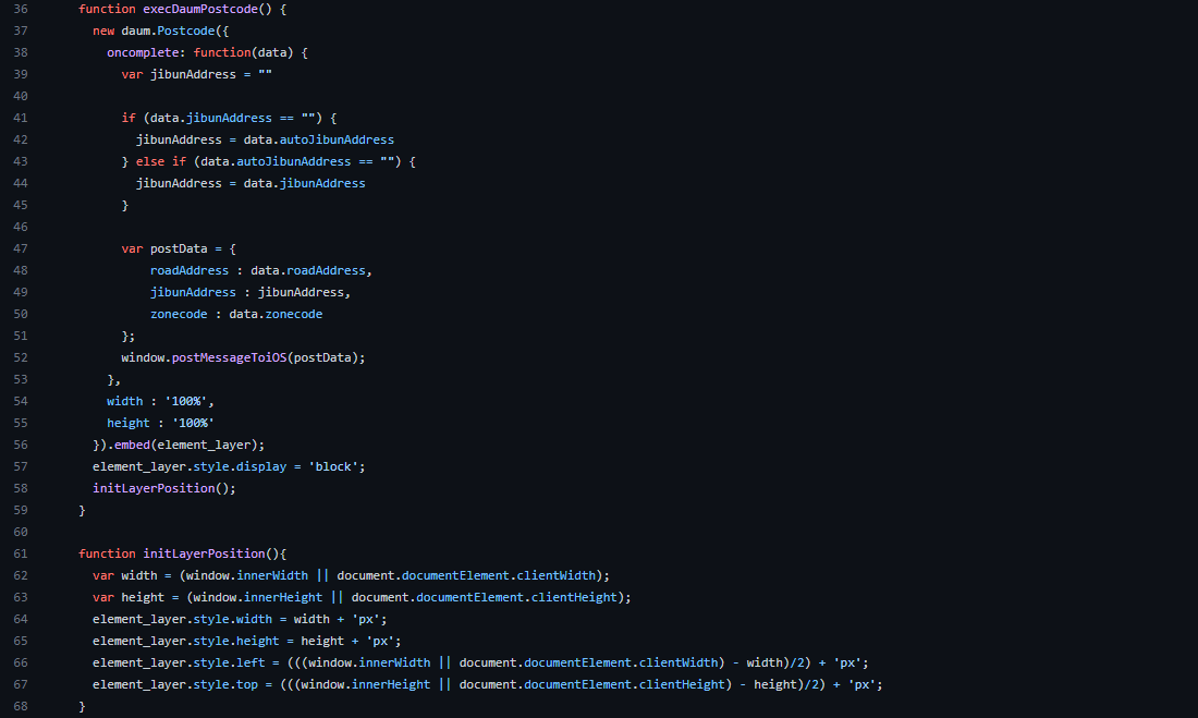 DOM이 onLoad 될 때 execDaumPostcode function을 실행하고 DOM의 대한 동적인 사이즈 조작은 initLayerPosition 함수로 이루어 진다. Android와 iOS 둘다 반응형을 구현하려면 Javascript로 DOM의 사이즈를 동적으로 조절해야한다.