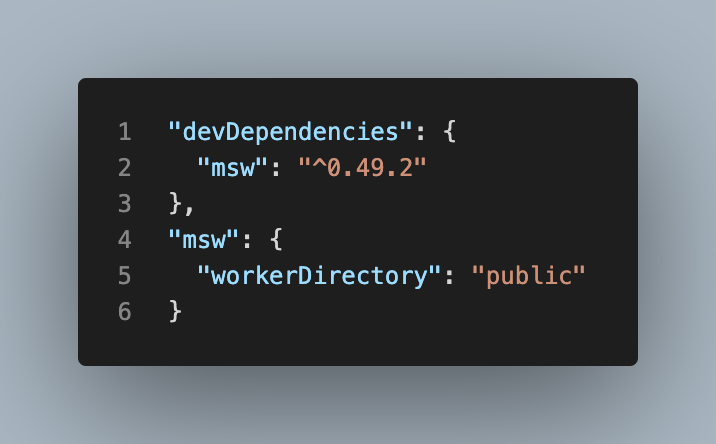 MSW 라이브러리 공식 홈페이지에서는 Worker의 Setup을 기본적으로 “public” 폴더에 설치를 권장하고 있는데 프로젝트 환경에 따라 다른 폴더를 지정해서 사용하는 것도 가능한 것 같다. 혹시나 "public" 폴더에 설치를 하고 나중에 바꾸고 싶다면 package.json에서 수정도 가능한 것 같다.