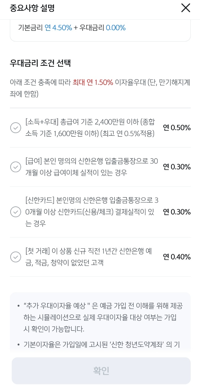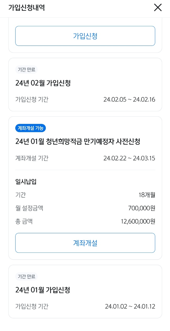 기존에 "신한은행"에 가입했었기 때문에 그냥 이번에도 신한은행으로 가입했고 "청년희망적금" 일시납입을 사전신청을 해야해서 청년도약계좌 상품안내 페이지에서 따로 사전신청을 하고 개인 요건의 대한 심사를 거쳐 가입이 가능하다는 통보를 받으면 가입이 되는 절차였다.