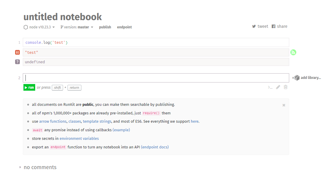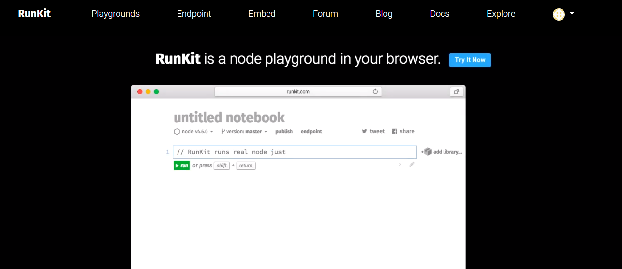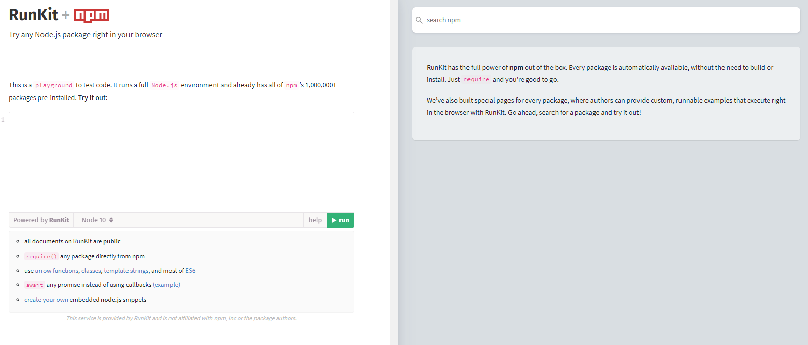 RunKit은 설치할 필요 없이 npm 포듈을 사용하고 결과를 시각화 할 수 있는 Javascript 환경을 갖게 된다.