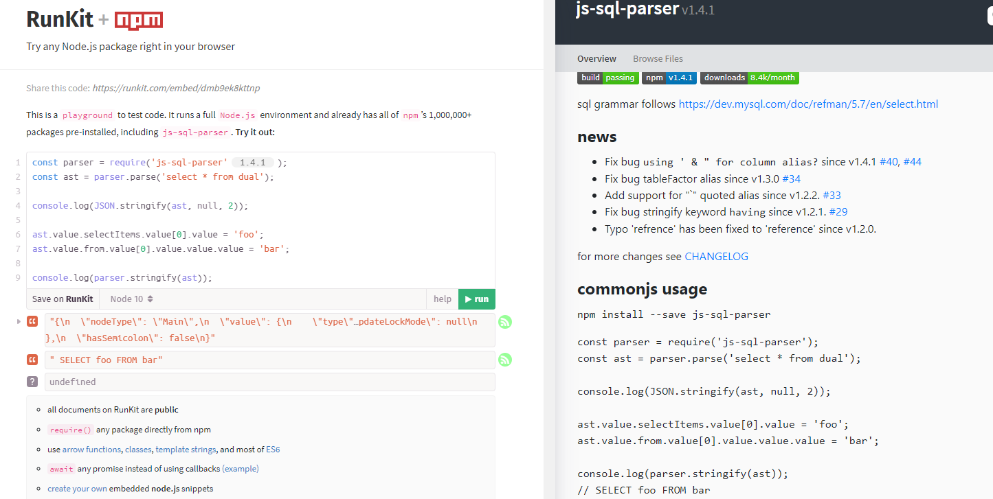한가지 예로 "js-sql-parser" 모듈을 검색 한 후 사용방법을 그대로 복사해서 RunKit에서 실행 했던 결과 바로바로 이 모듈이 어떤식의 결과값을 도출하고 어떤식으로 바로 확인할 수 있다는 장점이 있다.