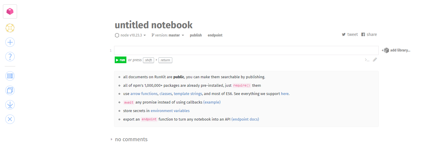RunKit은 "Notebook"의 개념을 사용한다. Notion이나 Evernote를 사용했던 사람들이라면 더욱 이해하기가 편하다.
