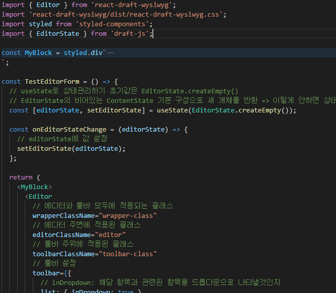 react-draft-wysiwyg 코드 예제 : [React]리액트에서 react-draft-wysiwyg , DraftJS 사용하여 에디터(Editor) 적용 후 Redux로 상태관리하기 :: SaDevelog (tistory.com)