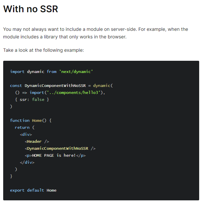 이럴땐 Next.js에서 기본적으로 지원해주는 Dynamic이라는 모듈을 사용하면 쉽게 해결할 수 있다.